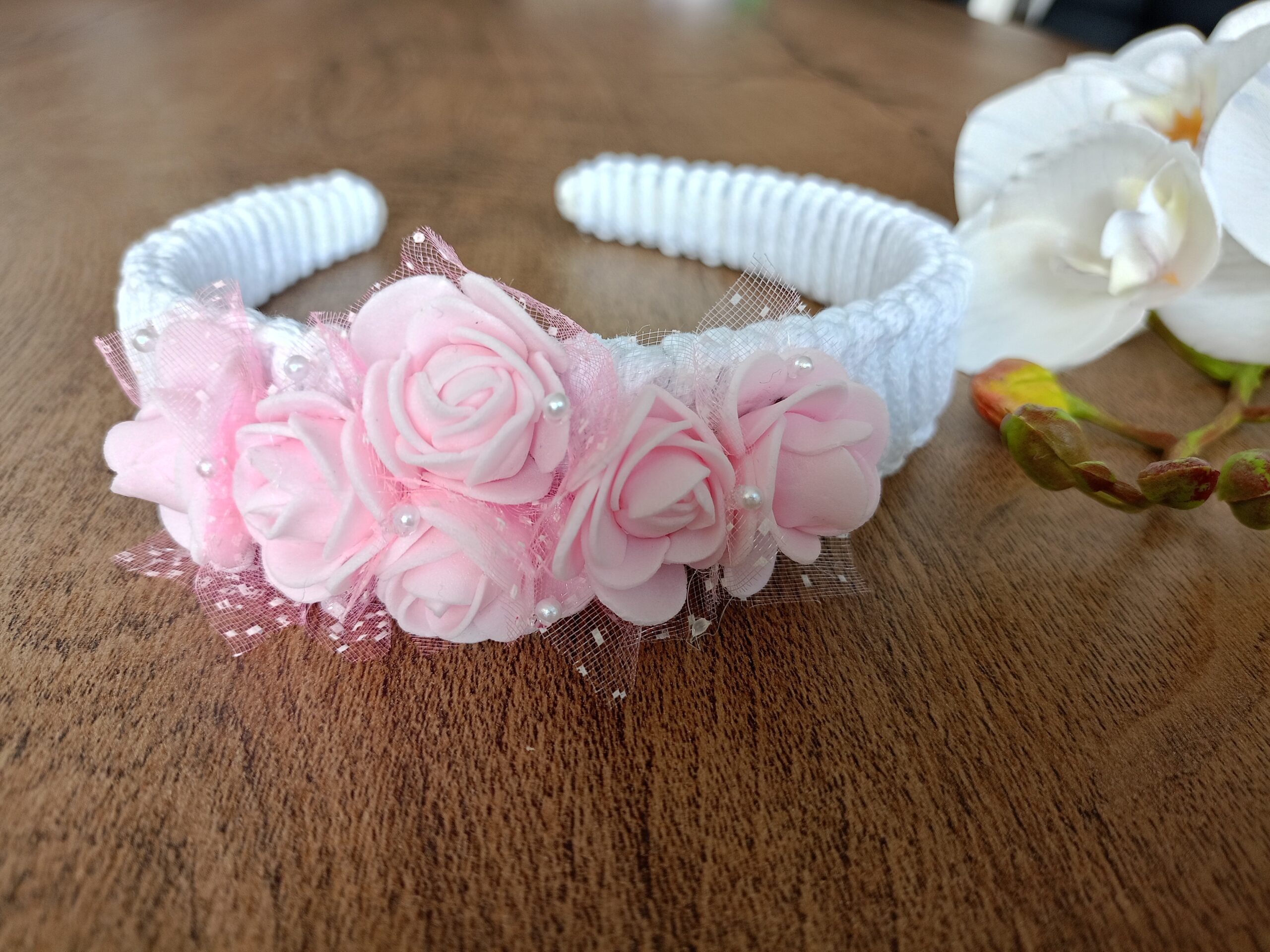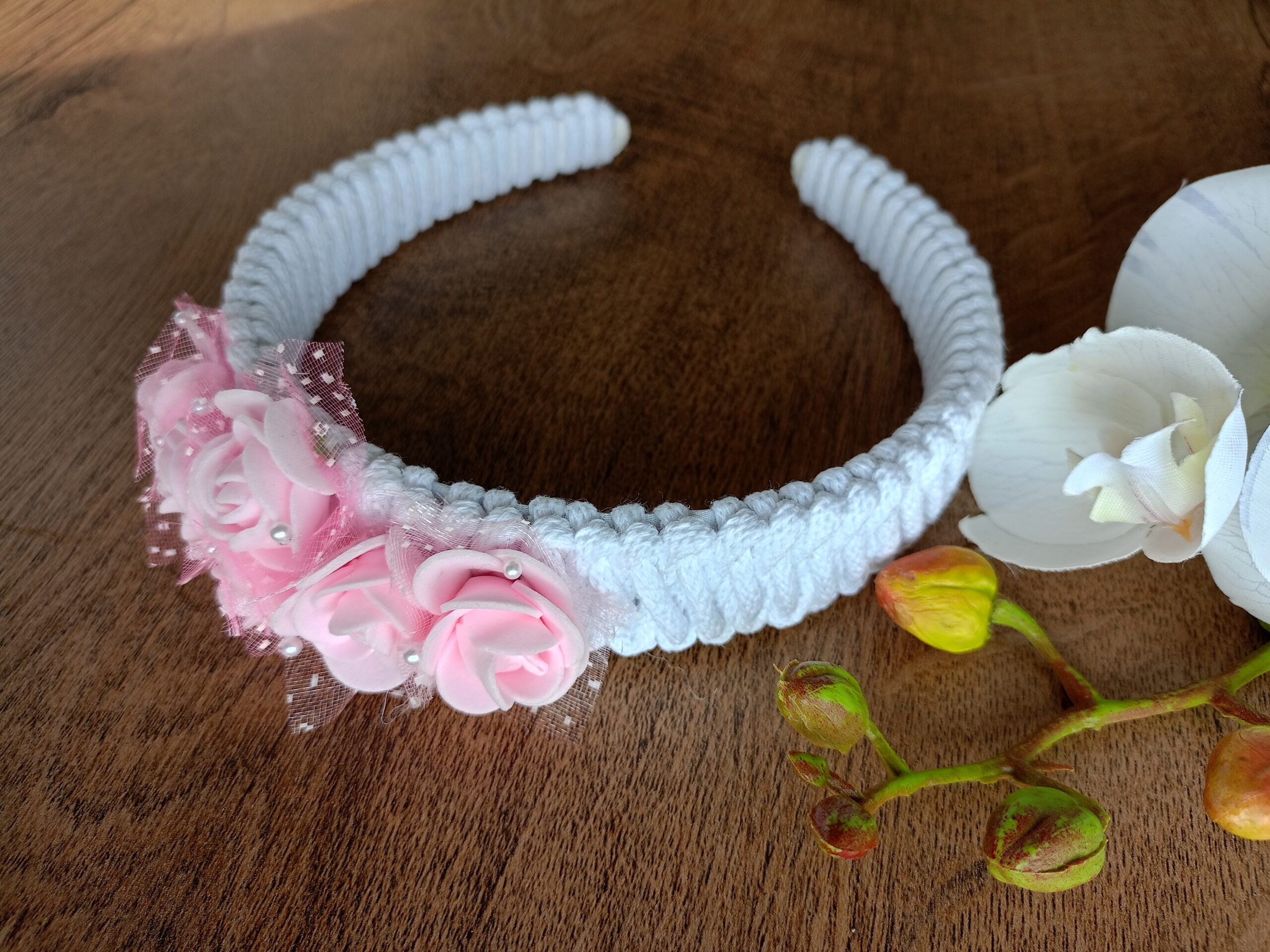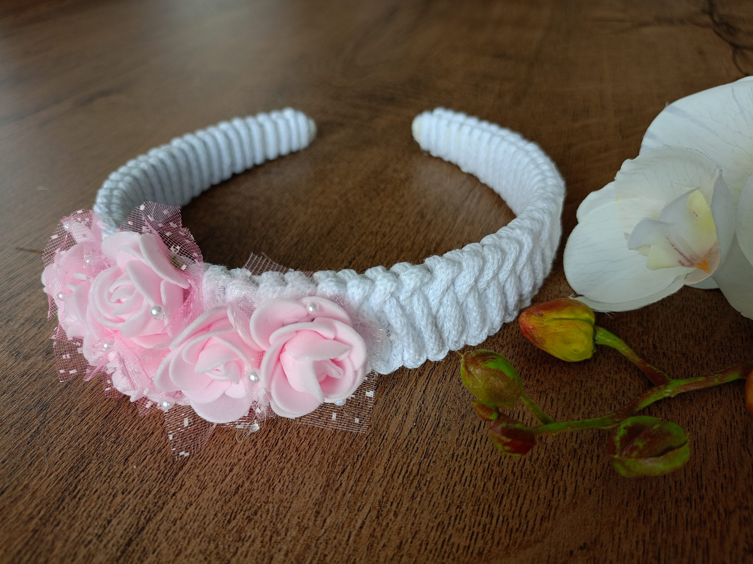 • materiały wysokiej jakości: dekoracja – kwiaty wykonano  z delikatnej w dotyku lecz trwałej pianki, otoczone tiulem, delikatnie ozdobione drobnymi białymi perełkami. Opaska – wykonana ze sznurka bawełnianego, który tworzy elegancki wzór.